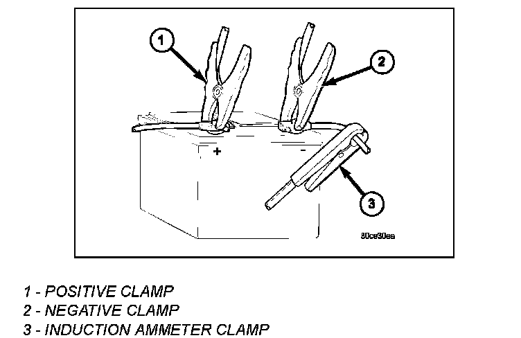 NOTE: Certain diesel equipped models use dual batteries. If equipped with dual battery system, tester should be connected to battery on left side of vehicle only. Also, tester current reading must be taken from positive battery cable lead that connects to starter motor.
