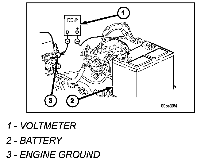 4. Connect voltmeter to measure between negative battery terminal post and a good clean ground on engine block. Rotate and hold ignition switch in Start position. Observe voltmeter. If reading is above 0.2 volt, clean and tighten negative battery cable attachment on engine block. Repeat test. If reading is still above 0.2 volt, replace faulty negative battery cable. Note: Certain diesel equipped models use dual batteries. If equipped with dual battery system, this procedure must be performed twice, once for each battery.