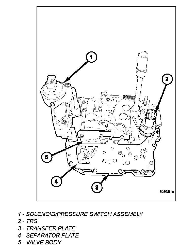 The Transmission Range Sensor (TRS) (2) is mounted to the top of the valve body inside the transmission and can only be serviced by removing the valve body assembly. The electrical connector extends through the transmission case.