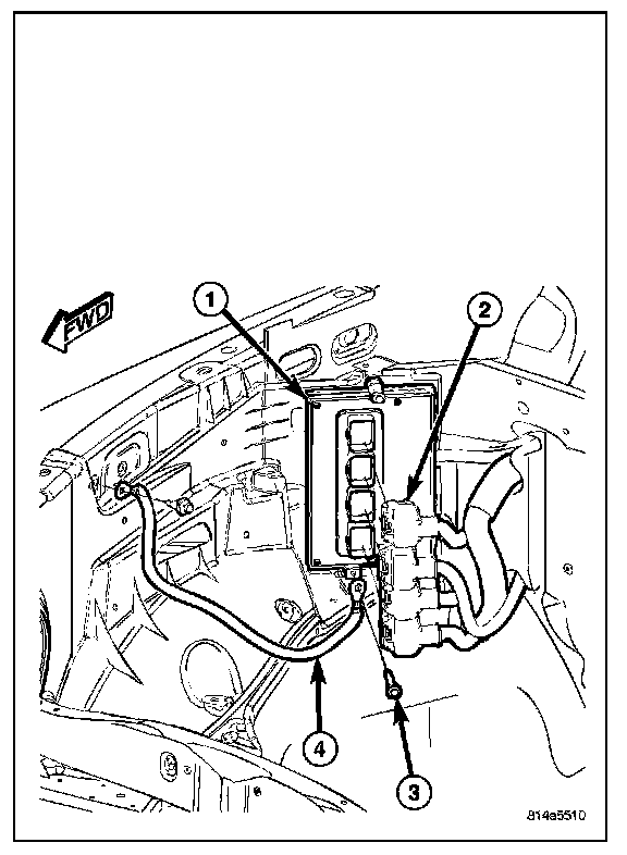 4. Be sure ground strap (4) is secured both at bottom of PCM, and at inner-fender.