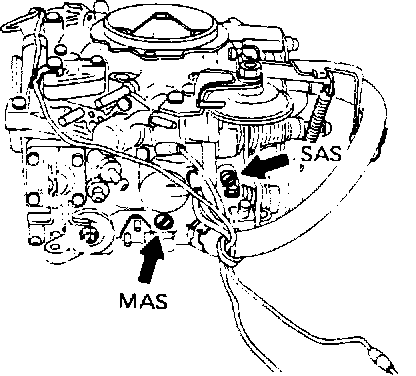 6. Check to see if the Mixture Adjusting Screw (MAS) seal has been removed. Fig. 3. If it has, perform an exhaust gas analysis. Adjust the MAS to bring CO to 0.5%. Recheck and adjust idle speed to 750 rpm. Install a new MAS seal.