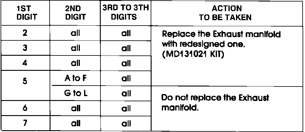 23. Remove the exhaust manifold heat protector. Check the ID number molded into the top of the exhaust manifold. Fig. 9. Take action as shown in the table below. If the manifold is cracked, replace it.