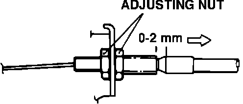 c) If not, loosen the adjusting nut and reposition the cable to obtain the desired free play of 0-2 mm.