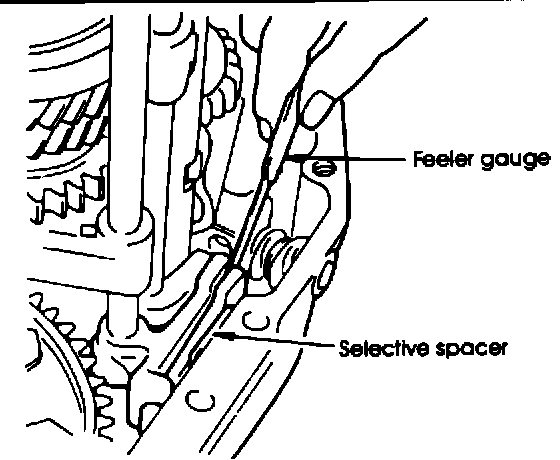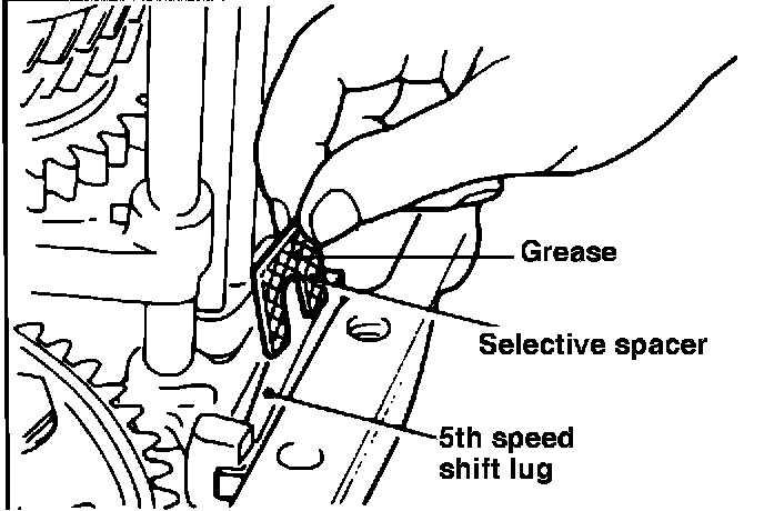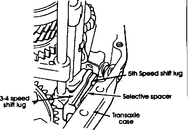 4. Apply grease to the selective spacer to hold it in place during assembly, and slip it between the transaxle case and the 5th speed lug as shown in Fig. 3.