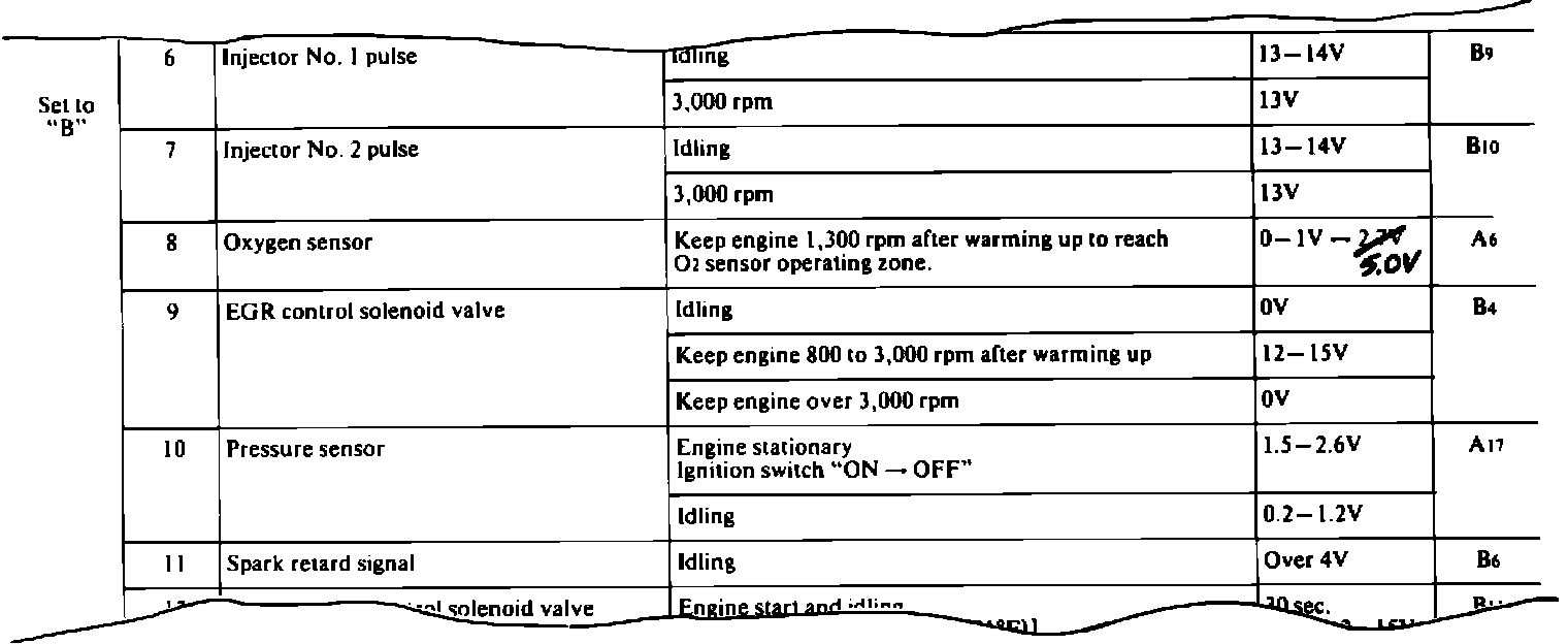 at "8" will be from 0-1V to 5V rather than from 0-1V to 2.7V as shown in the chart on p. 14-27 of the 1983 Starion service manual reproduced below.