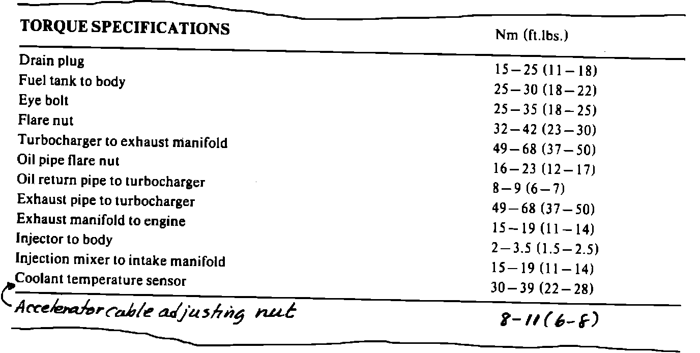 To the TORQUE SPECIFICATIONS tables on these pages, add the torque specification for the accelerator cable adjusting nut as shown below.