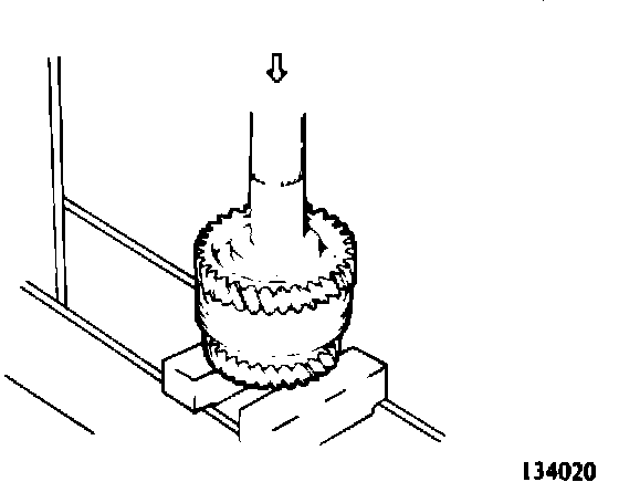 1. Support the second speed gear on a press base, and press the rear end of the mainshaft to remove the bearing inner race, gear bearing sleeve, first speed gear, 1 - 2 synchronizer and second speed gear. (134020)