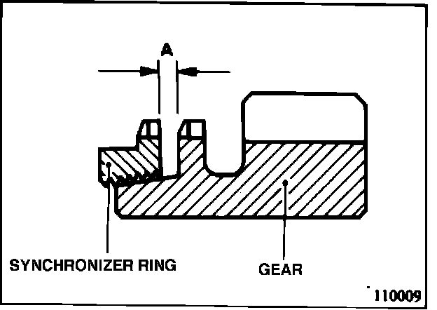 2. With synchronizer ring assembled to the cone of each gear, check the dimension "A". If "A" is less than 0.5 mm (0.020 in.), replace the synchronizer ring and/or gear. (110009)