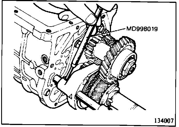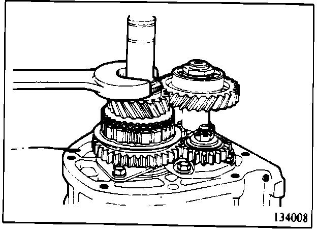 2. Bend back the lock washers and loosen the two locking nuts (Mainshaft and countershaft rear ends.) The nuts can be loosened by double-engaging reverse and 2nd gears. (134008)