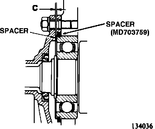 6. When installing the retainer, select and install a spacer of proper size so that the clearance "C" will be of specified value. Apply sealant to both sides of the front bearing retainer gasket and gear oil to the oil seal lip. (134036)