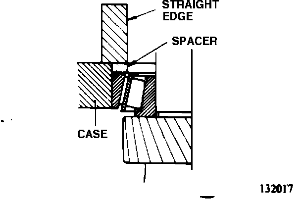 (4) Put a straight edge on the spacer and try to turn the spacer with your index finger. If the spacer turns lightly, replace it with a spacer one size [0.03 mm(.0012 in.)] thicker, and similarly turn this spacer. In this manner choose and install a spacer which makes the clearance between straight edge and the spacer closest to 0. Make sure that the bearings are NOT preloaded.