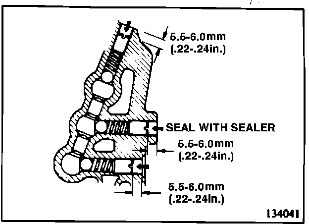17. Insert the ball and poppet spring into each shift rail. Tighten the plug to specified position. Install the poppet spring with the small end towards the ball side. After installation, seal the plug heads with sealer. (134041)