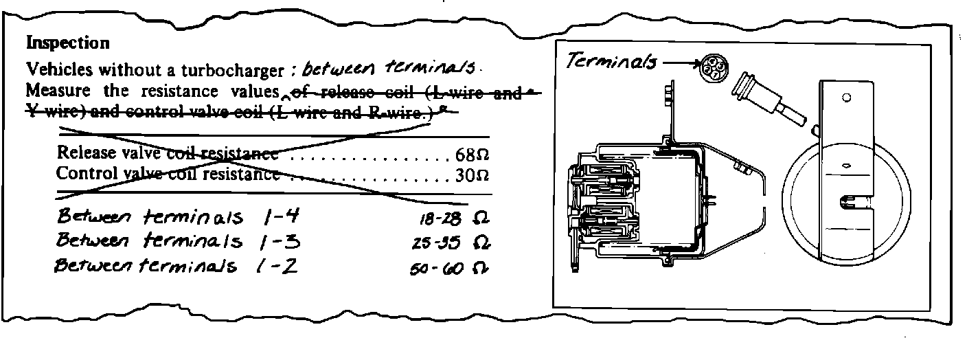 Test values for the speed control actuator have been changed. The June issue of this bulletin contained orange labels to be placed at the tops of pages 8-177 of the 1984 Cordia/Tredia Service Manualand 8-164 of the 1983 Cordia/Tredia Service Manual as reference to this bulletin.