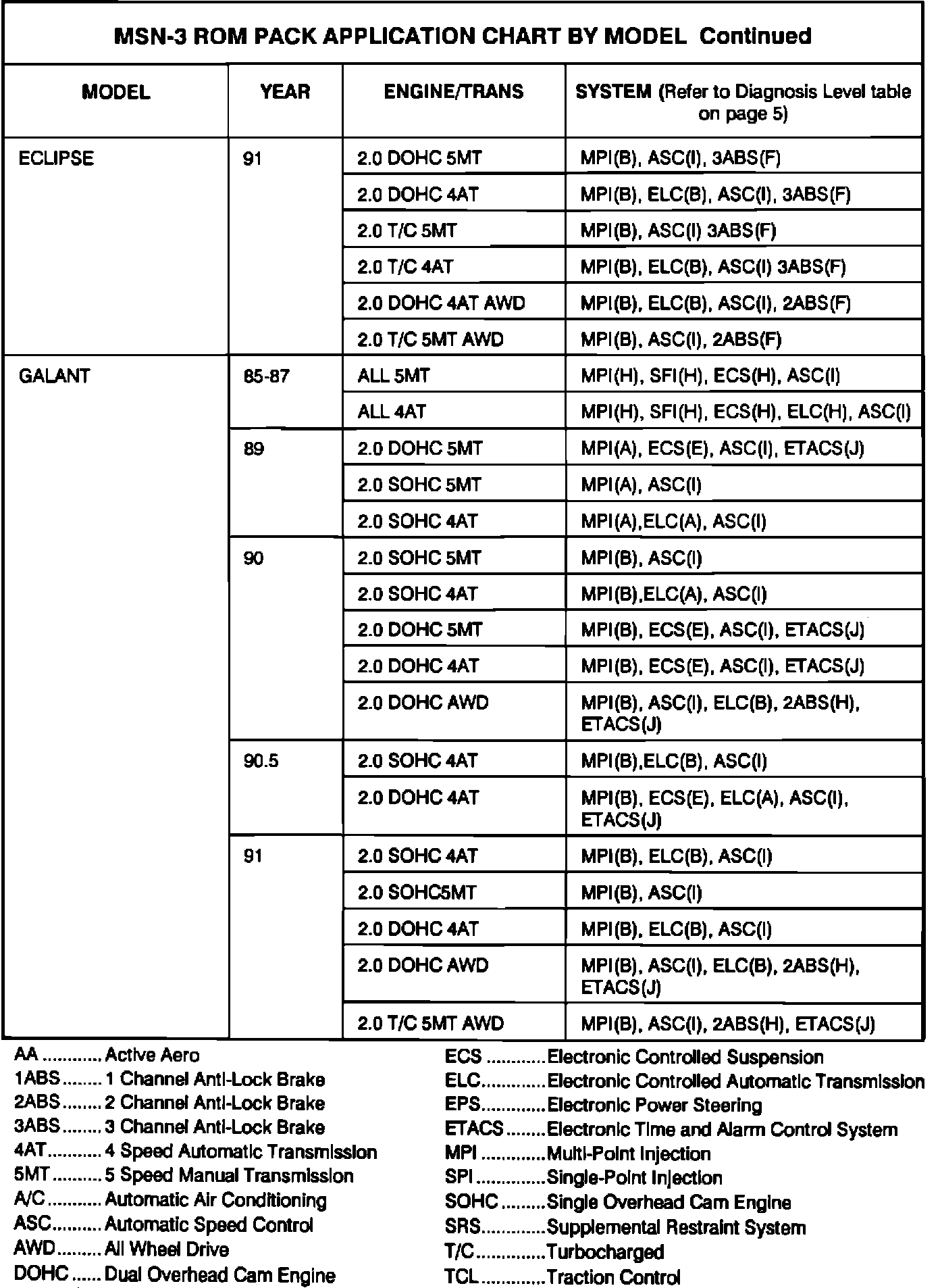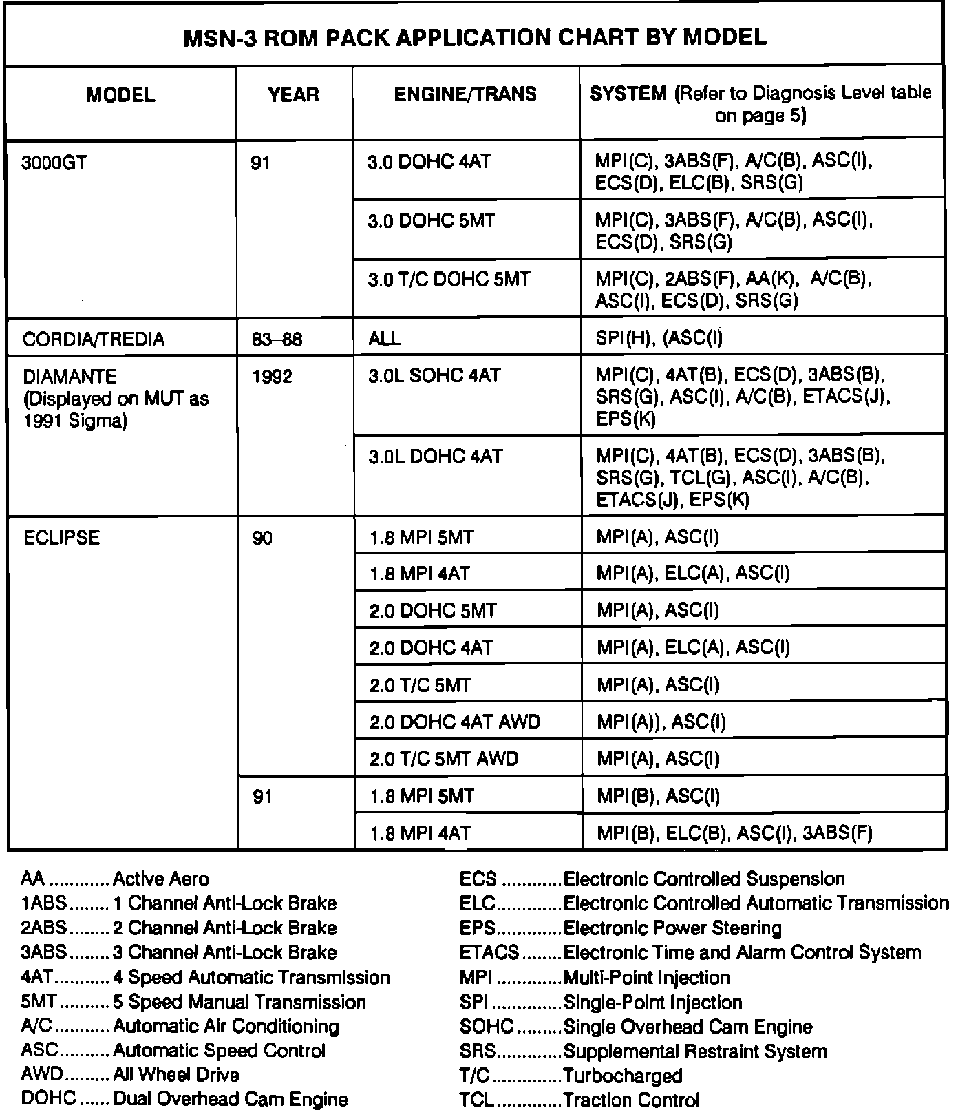 MSN-3 ROM PACK APPLICATION CHART BY MODEL