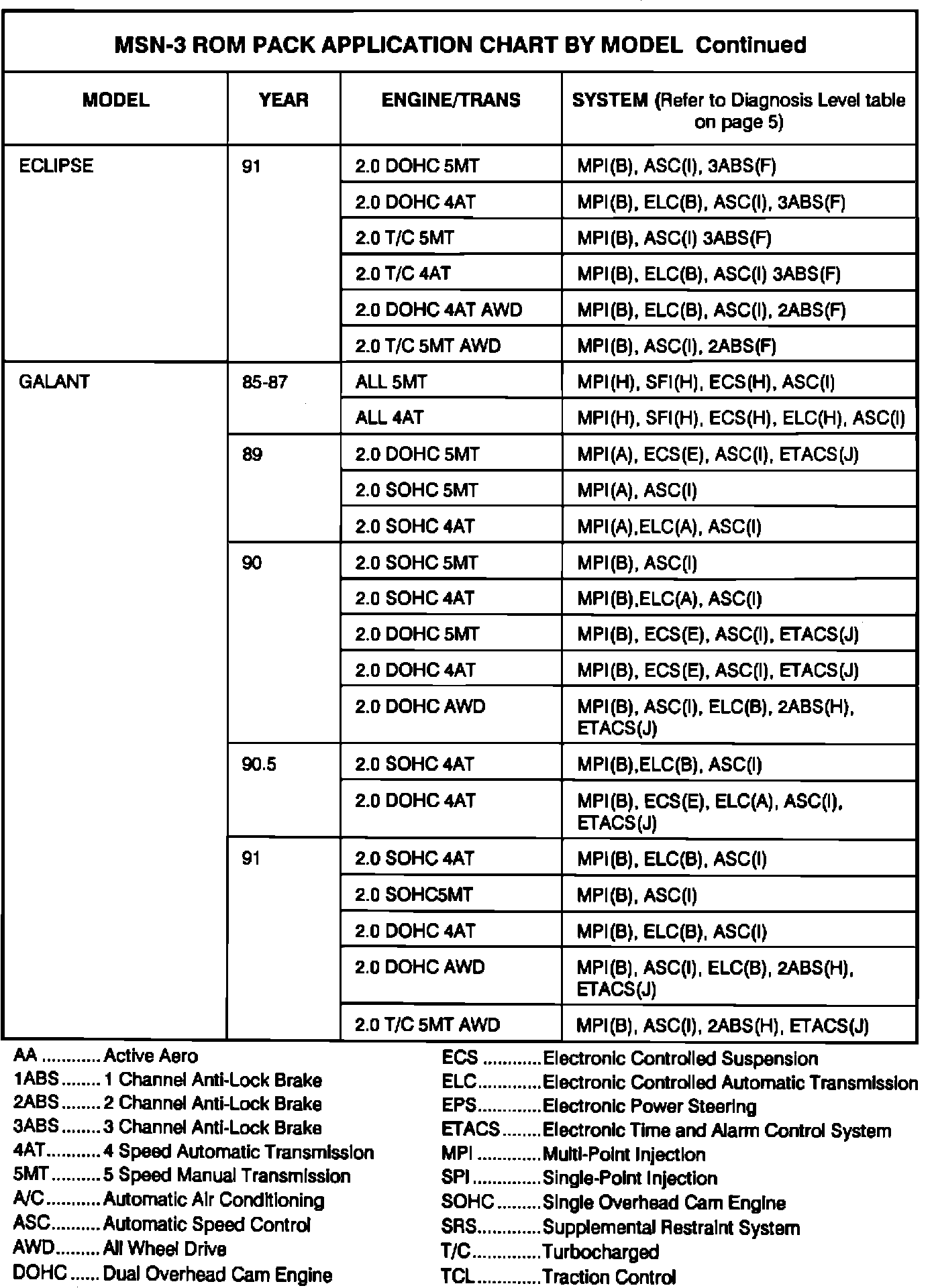 This bulletin lists vehicles and systems that can be tested using the Multi-Use Tester ROM Pack MSN-3 (Part Number MB9911359). This ROM pack can be used in place of earlier