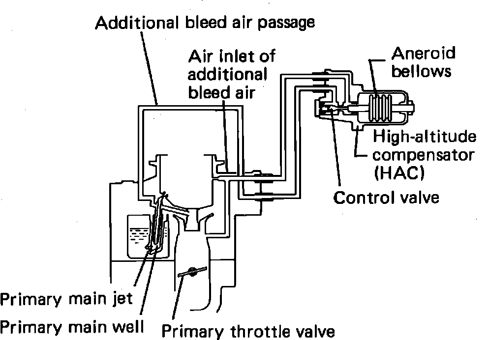 The fuel/air ratio is maintained at high altitude by the HAC to approximately the same ratio as sea level by supplying additional bleed air into the primary main well through a valve controlled by an aneroid bellows of the HAC. Fuel/air radios are controlled precisely by the feedback carburetor with high altitude compensation to comply with the applicable emissions standards at all altitudes.