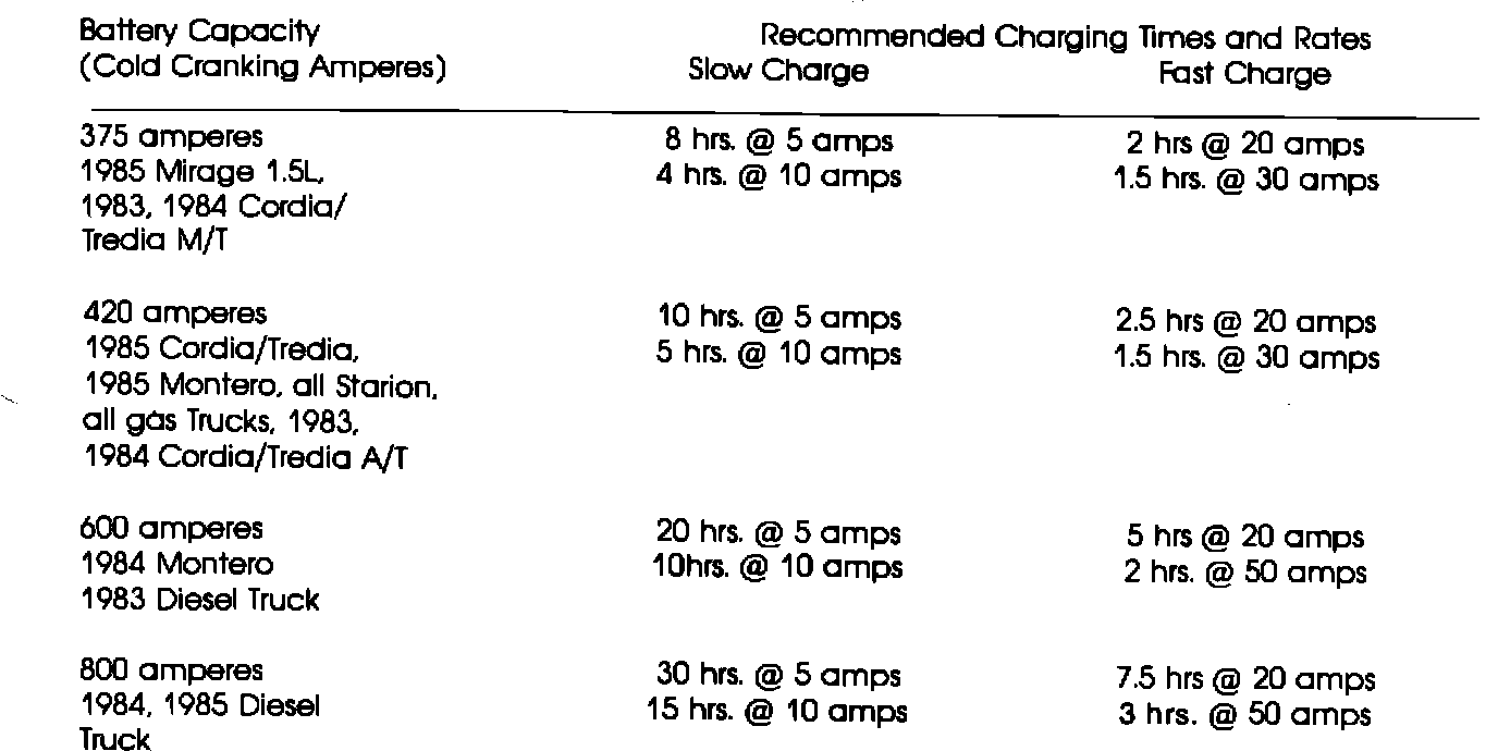 Reports received from the Northern sales areas during last winters cold spell suggest that there is a need for a review of charging practices for the maintenance-free batteries used in Mitsubishi cars and trucks. The reports we received included comments such as, "battery doesn't have enough capacity to start the car on cold mornings", or "battery seems too small for this extreme climate." However because the batteries in Mitsubishi vehicles are generally larger than necessary for good starting under the worst expected weather conditions, we must assume when we receive complaints like these that: