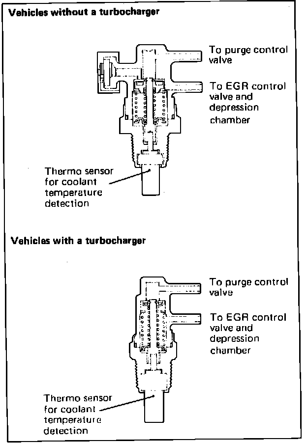 The thermo valve, Fig. 111 in the EGR vacuum supply line is a vacuum switch sensitive to engine coolant temperature. The thermo valve eliminates the vacuum signal to the EGR valve during warm-up when fewer NOx emissions are generated. Less EGR flow during warm-up helps to maintain acceptable driveability.