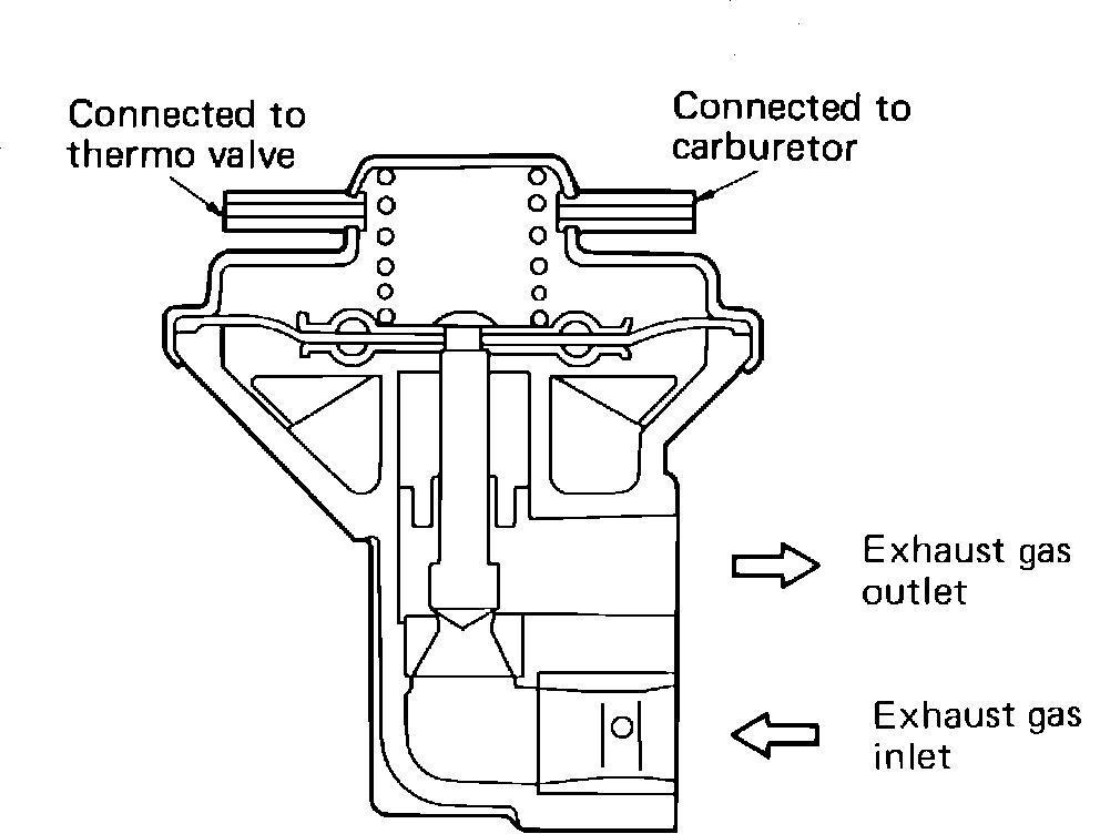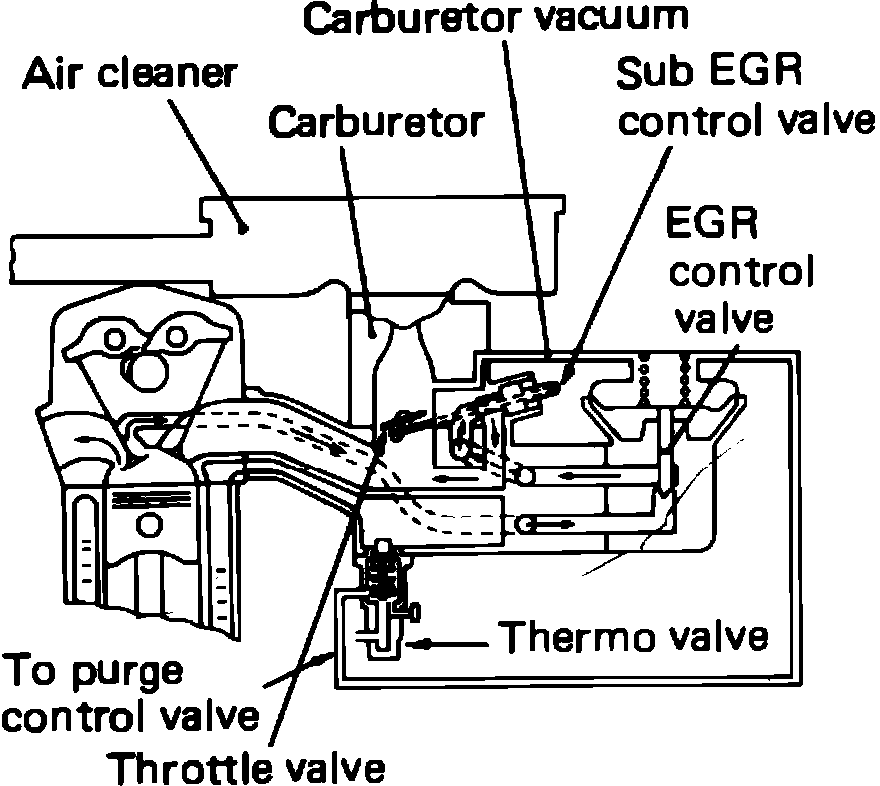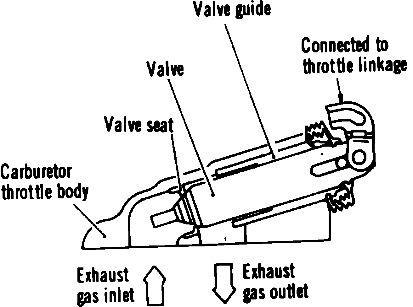 EGR uses partial recirculation of the exhaust gases from a port in the cylinder head to a port in the intake manifold. The EGR valve, Fig. 30 controls the flow of exhaust gas in response to a vacuum control signal from a thermo valve.