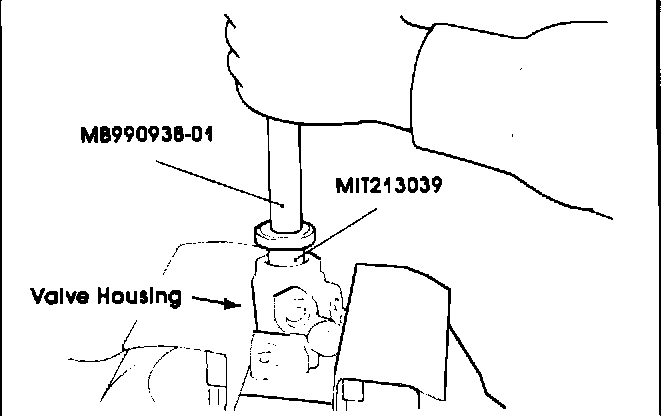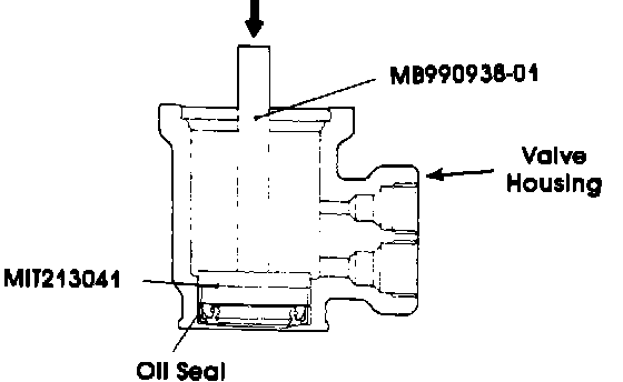 36. Now, slip Pinion Shaft Upper Bearing Seal Installer MIT213049 over Handle MB990938-01 and then put the pinion shaft upper bearing seal on the tool. Lubricate the outside surface of the seal, and push the seal into the housing.