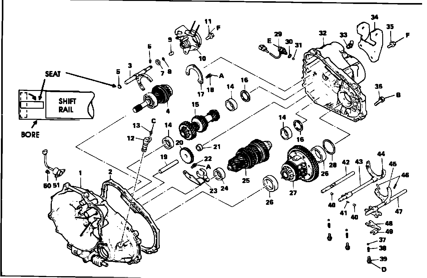 DESCRIPTION If the 5-speed manual transaxle in a Cordia/Tredia or Mirage can be shifted only between Neutral and 5th gear the cause may be a displaced seat in the select shift rail bore.