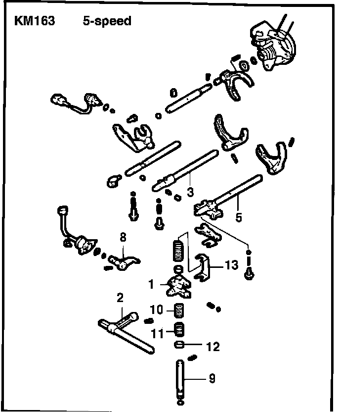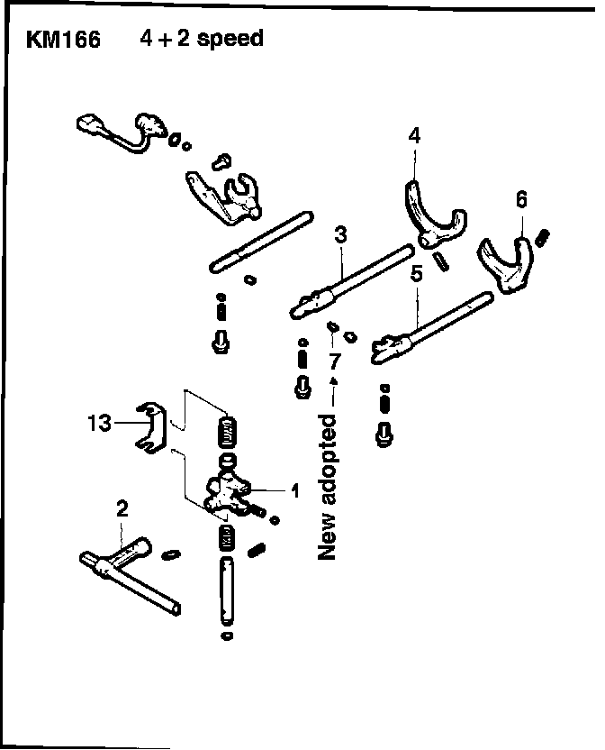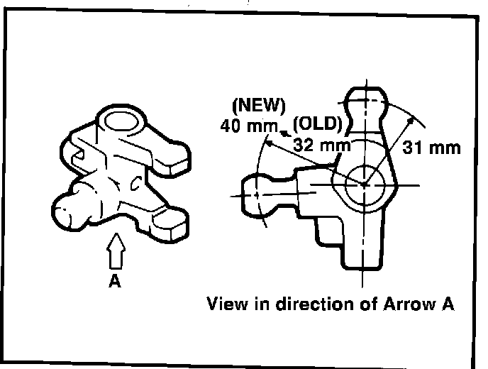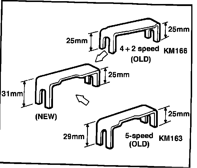 (1) Control Finger - the lever ratio has been changed from 1.03 (32 mm/31 mm) to 1.29 (40 mm/31 mm). See Figure 3. Also, in the KM166 4+2 speed transmission, a lever has been added to the control finger. The old and new parts are compared in Figure 4.