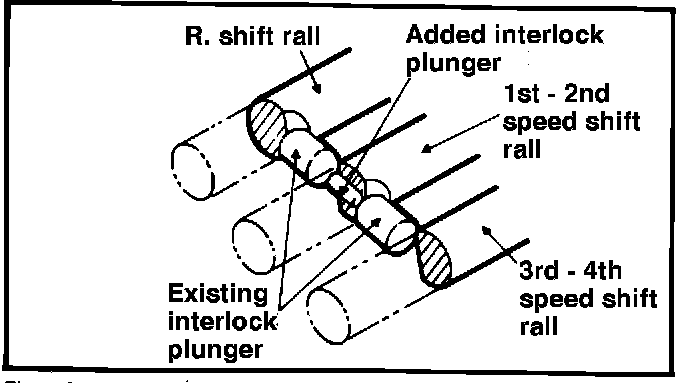 (7) Interlock Plunger Added - An interlock plunger has been added to the 1-2 shift rail of the 4+2 speed transaxle to prevent double engagement. See Figure 8.