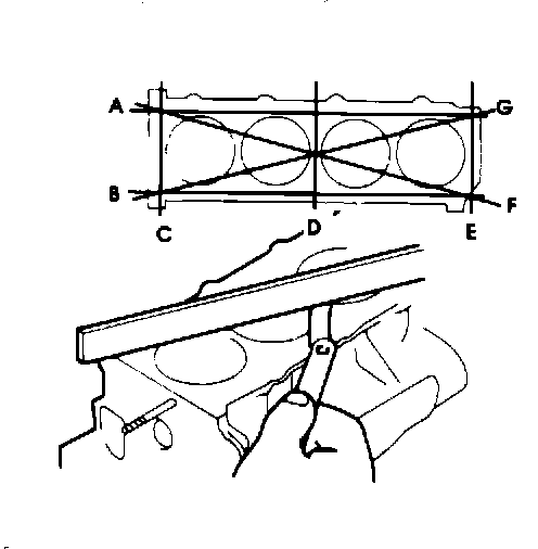 While pressing down lightly on the center of the straightedge, attempt to insert a 0.1 mm (.004") feeler gauge between the block and head at several points as shown in Fig. 1. Repeat the process with the straightedge in positions B-G, A-G, and C-E.