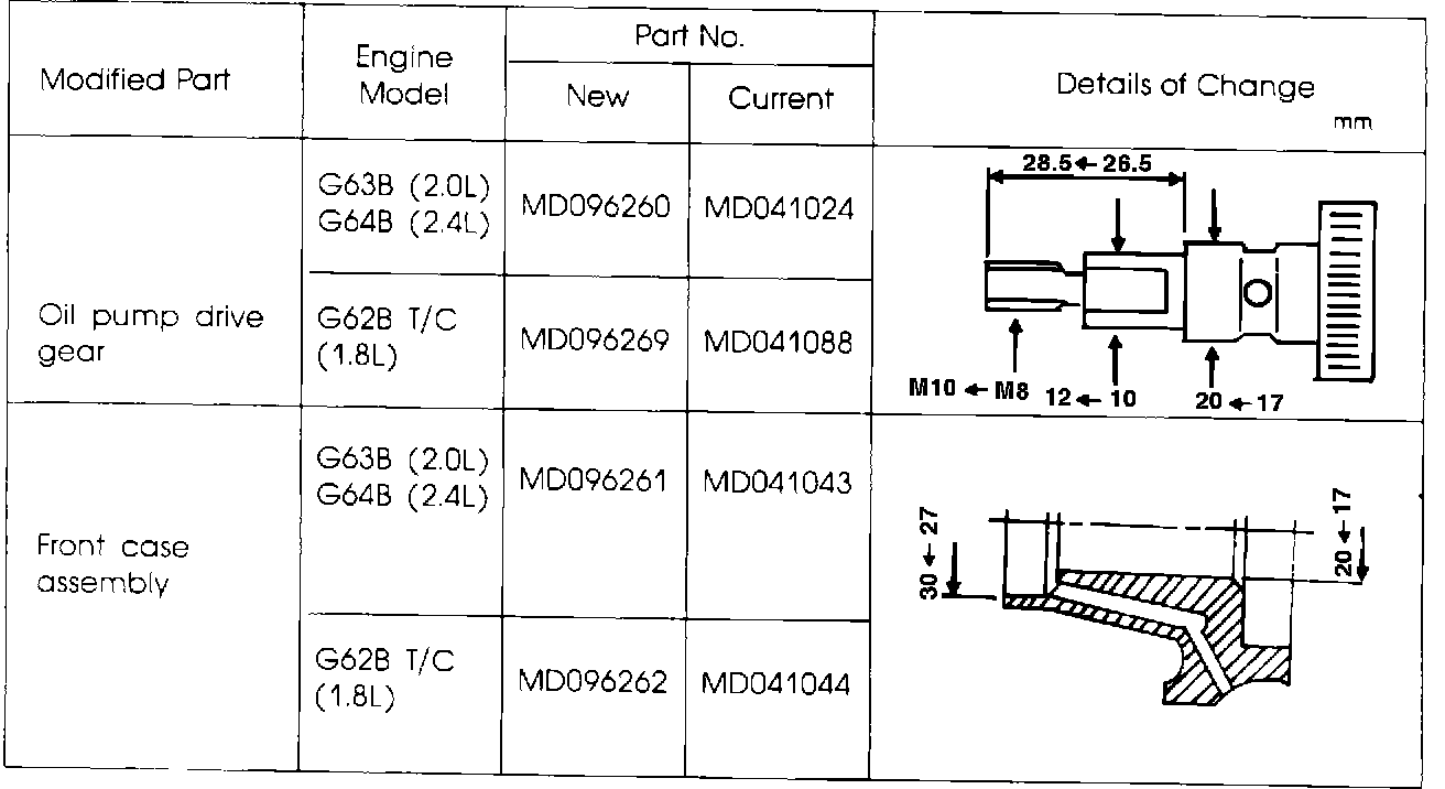 INTERCHANGEABILITY Parts are interchangeable in sets but not individually. For example, if replacing an earlier drive gear with one of later design, you must also replace the front case assembly, oil seal, oil pump sprocket, nut and timing belt lower cover. Note the significant increase in tightening torque for the new, larger-diameter nut.