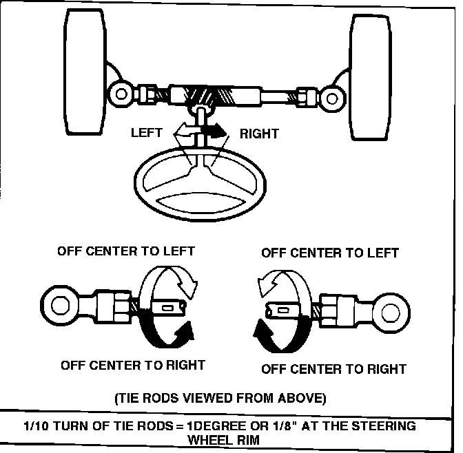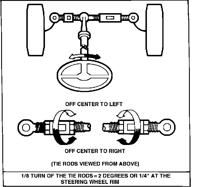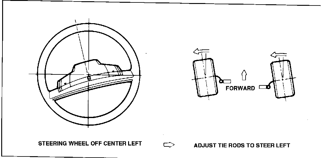 If a customer should require further adjustment to the steering wheel after following the procedure in Step II, the following steps may be taken. All involve adjustment of the tie rods. In general, the tie rods are adjusted to steer the front wheels in the same direction that the steering wheel is off center. If the steering wheel is off center to the left, center it by adjusting the tie rods to make the front wheels steer toward the left, and vice versa, as shown in Figure 5.