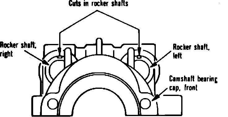 4. On all models, position intake and exhaust rocker shafts into front camshaft bearing cap. Position shafts as shown in Fig. 17. Install bearing cap bolts retaining shafts in position.