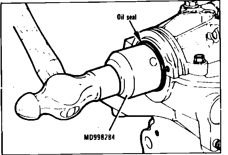 8. Lubricate camshaft front oil seal lips with engine oil, then install seal into camshaft front bearing bore using tool MD998284 or equivalent, Fig. 19. Tap seal into bore until tool contacts distributor drive gear.
