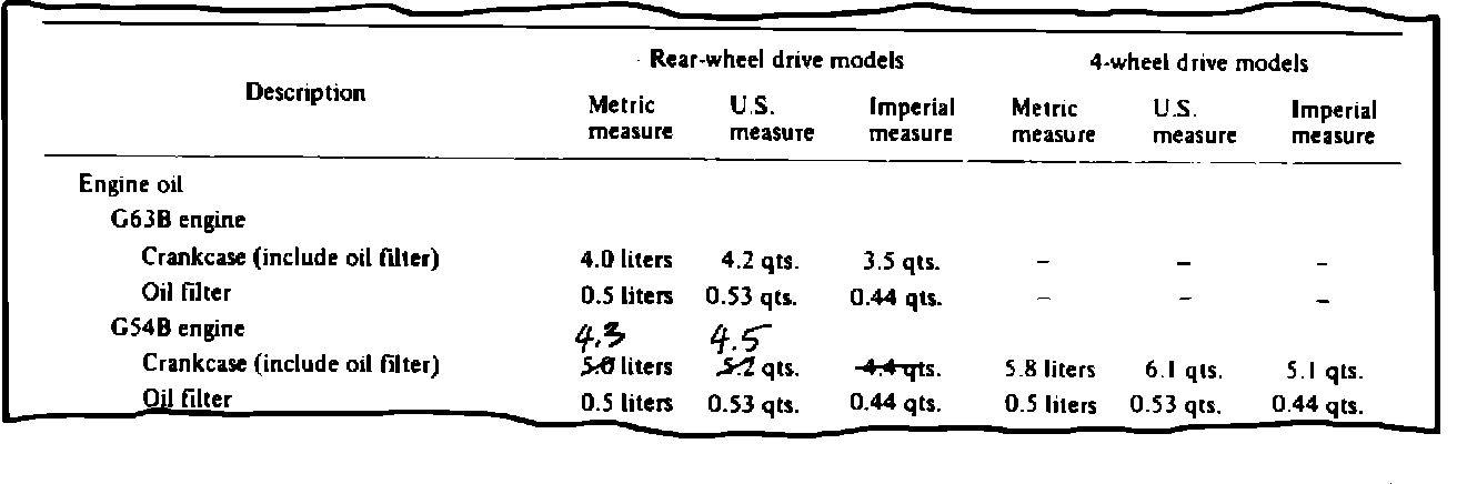 The correct crankcase oil capacity including oil filter for the 2WD Truck with the 2.6L (G54B) engine is 4.5 U.S. quarts (4.3 liters) as shown below.