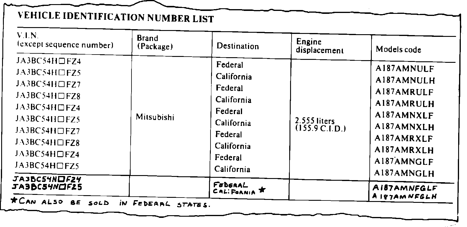 3. Two new model codes are added for Federal and California Starions. The California Starion is certified as a 50-state vehicle.