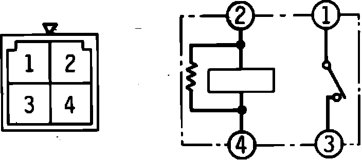 Check for continuity between fan motor relay terminals. With no battery voltage applied to relay, continuity should be present between terminals 2 and 4, Fig. 3. With battery voltage applied to terminals 2 (positive) and 4 (negative), continuity should be present between terminals 1 and 3, Fig. 3.
