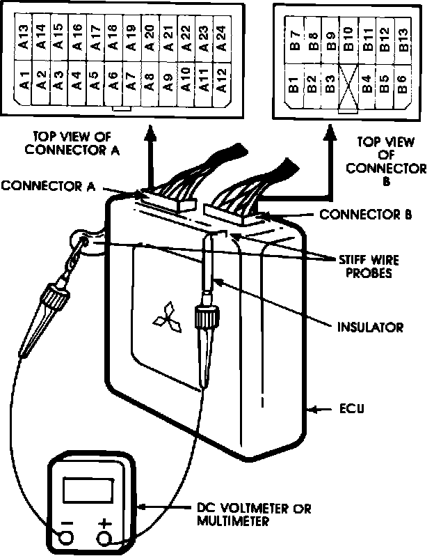 Voltages are measured right at the computer on the right cowl kick panel. Attach thin wire probes to your digital voltmeter. Insert the probes into the tops of the connectors on the computer as shown in Fig. 1.