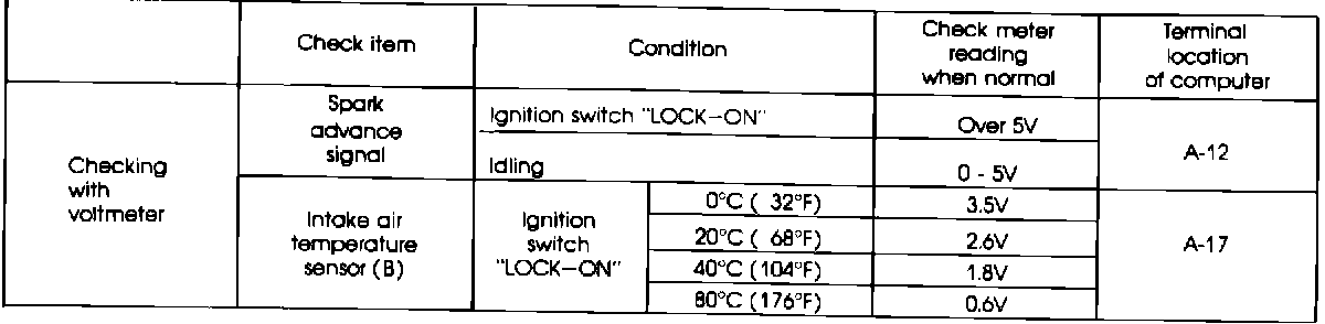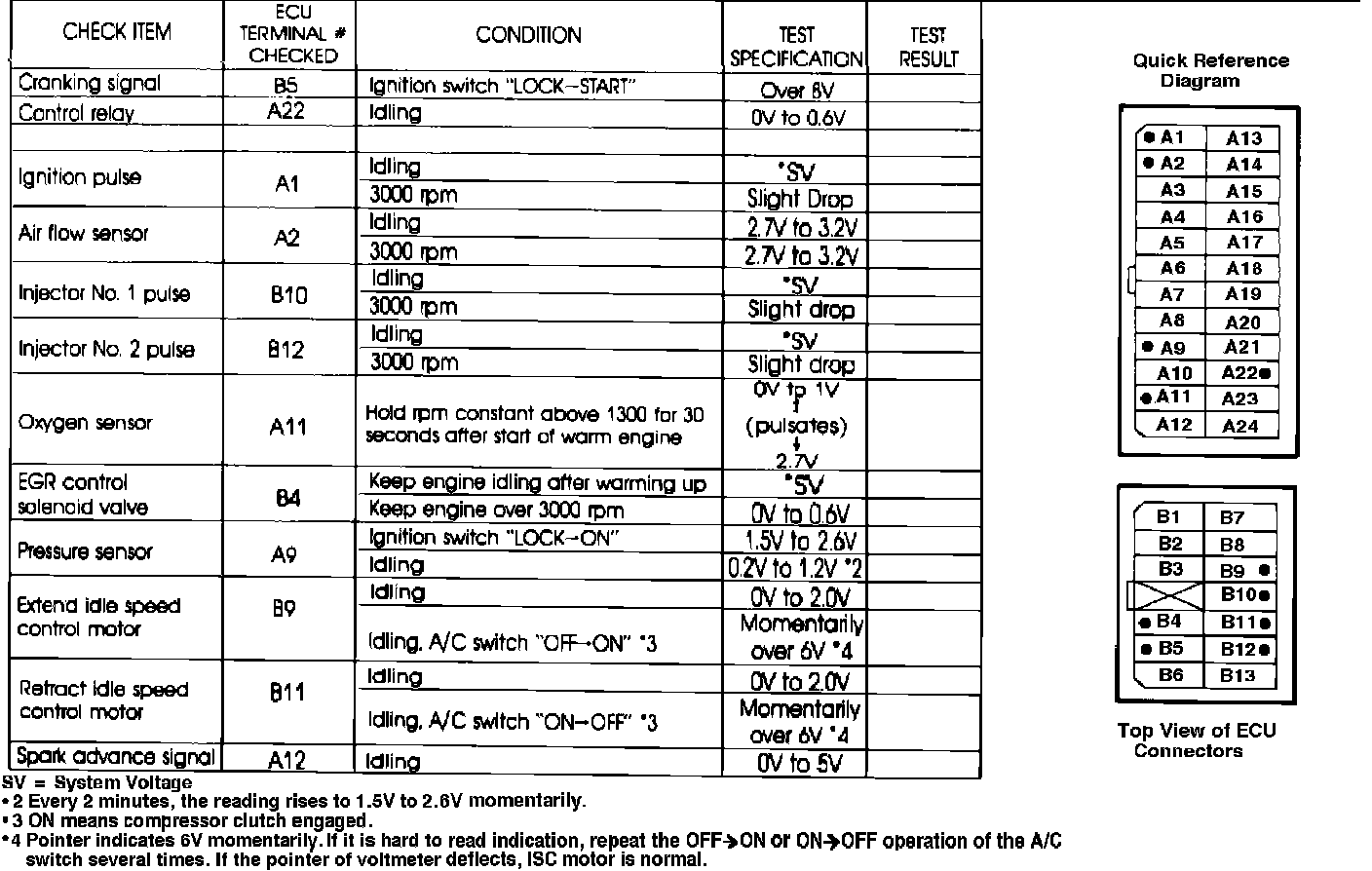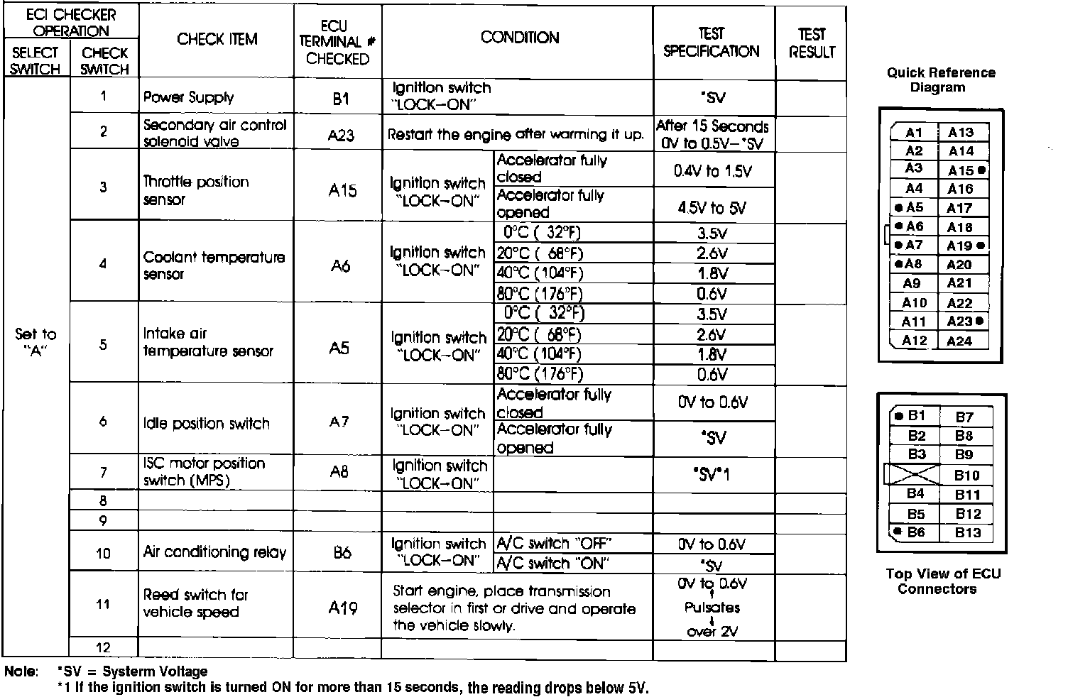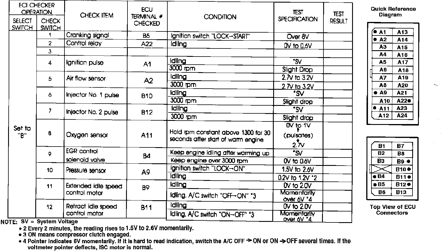 PURPOSE ECI test values for the 1985.5 Starion with intercooler are different from those published in the 1985 Starion Service Manual. The tables on pages 14-30 and 14-31 do not apply to models with intercooler, and the terminal connectors on the ECU are also different. Therefore, when performing an ECI voltage check on a 1985.5 Starion with intercooler, use the information in this bulletin instead of the information in the Service Manual.