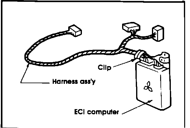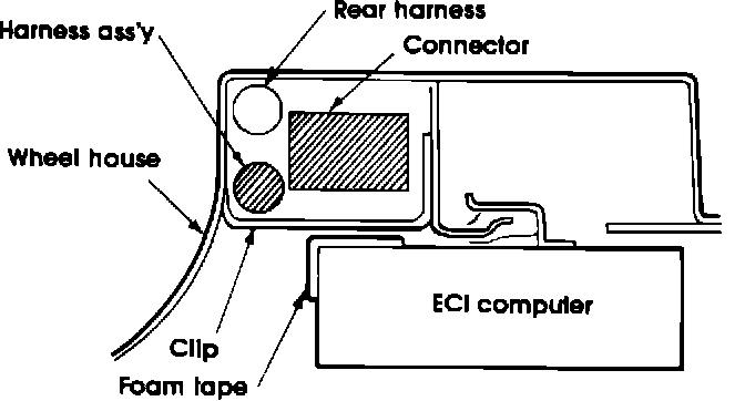 NOTE: Clip the harness to the front harness at the point marked by yellow tape, and route the harness over the air duct to support it as in Fig. 10. Connect the ground wire to the computer mounting screw.