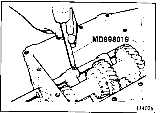 14. Using special tool MD998056, remove synchronizer hub and overdrive gear bearing sleeve.