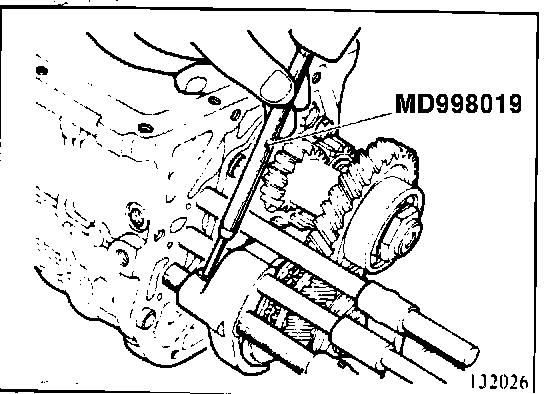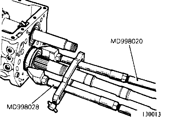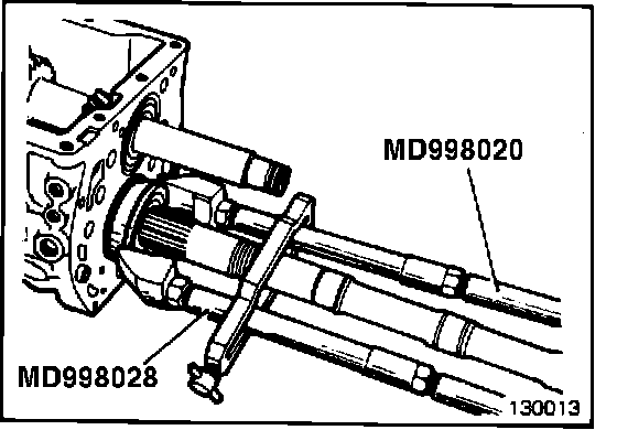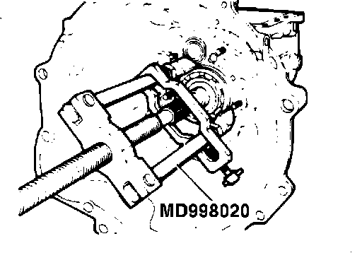31. Remove mainshaft center bearing with bearing puller (MD998020) and adapter (MD998028). (130013)