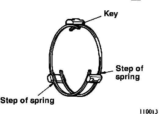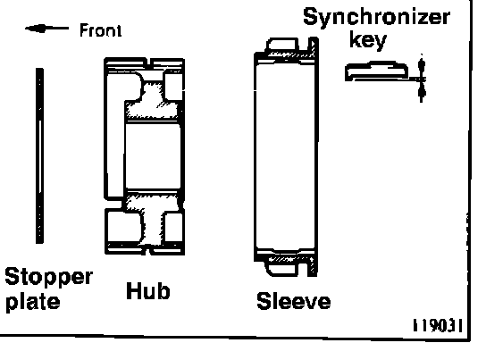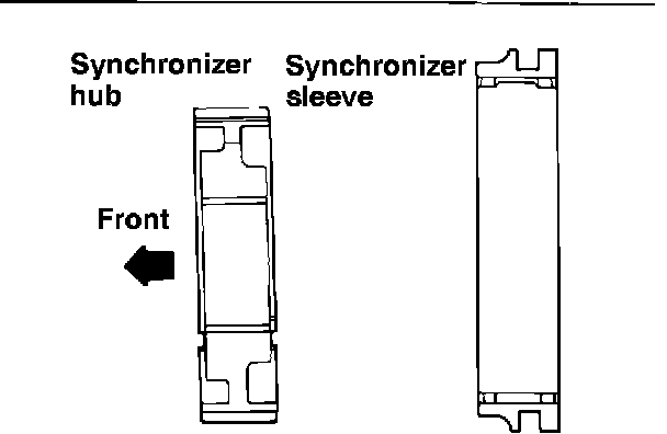 18. Assemble the overdrive synchronizer. The front and rear directions of the synchronizer hub and sleeve can be identified as illustrated. (134027) The spring can be installed in a manner similar to the installation of the 3-4 and 1-2 synchronizer springs.
