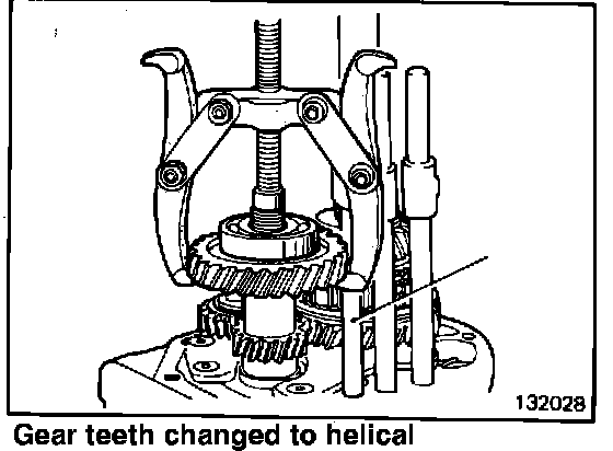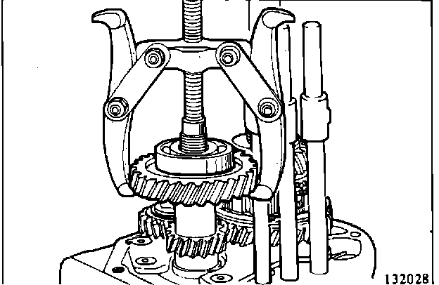 17. Use a gear puller to remove the counter overdrive gear and the ball bearing. Remove these parts and the 1-2 shift rail at the same time. (132028)