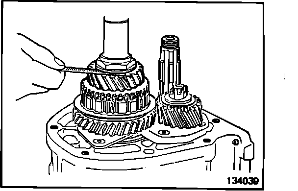 19. Install the spacer, the stop plate, the overdrive synchronizer assembly, the overdrive gear bearing sleeve, the needle bearing, the synchronizer ring and the overdrive gear, in that order, onto the mainshaft from the rear end. Tighten the lock nut and stake it at the mainshaft, notch and then check the overdrive gear end play. (134039)