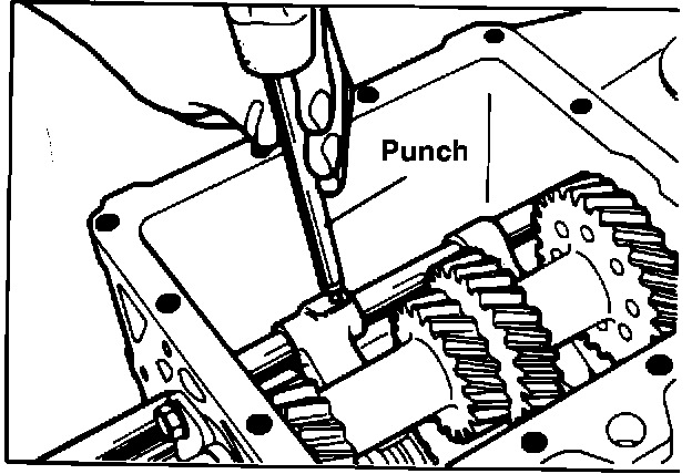 27. Remove the reverse idler gear shaft by driving from the inside of the case with a punch.