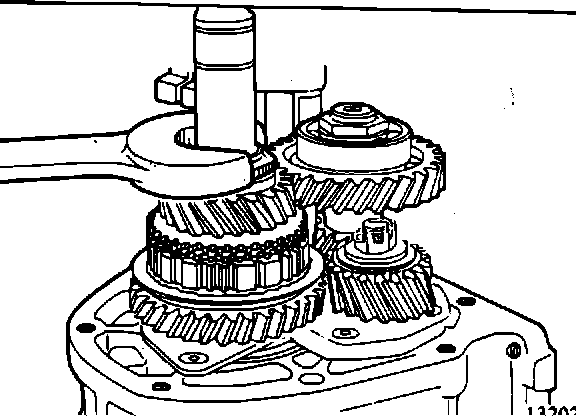15. Bend back the locking nut lock tabs and loosen two locking nuts mainshaft and counter rear ends). Nuts can be loosened by double-engaging reverse and 2nd gears.