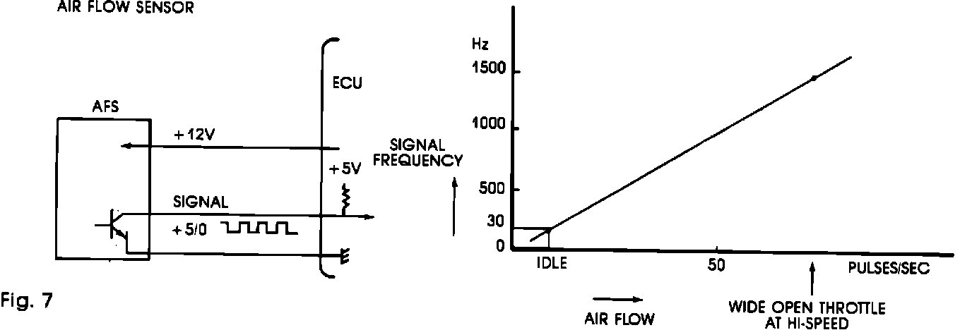 To diagnose trouble in the system, it is useful to know how each sensor influences the pulse length and/or frequency. As you may remember, the air flow sensor is the only sensor whose signal is not a variable voltage. It is instead a pulsating constant voltage of varying FREQUENCY. The higher the air flow, the faster the air flow sensor pulses. Other sensors - throttle position sensor, air and engine temperature sensors, manifold pressure sensor, and throttle position sensor - put out variable voltages. The O2 sensor acts almost like an ON/OFF device, its output fluctuating back and forth between about 0.9V when the mixture is rich and about 0.1V when the mixture is lean.The illustrations which follow show the output characteristics of the various sensors under normal conditions.
