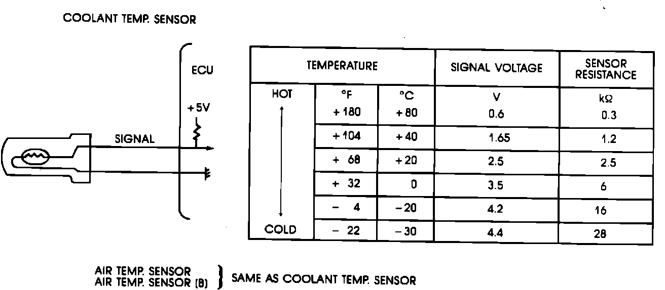 The coolant sensor and air temperature sensors both have the same characteristics: their output voltages range between about 1/2 V hot and 5V cold. Fig. 8 shows signal voltages and sensor resistances at five different temperatures.
