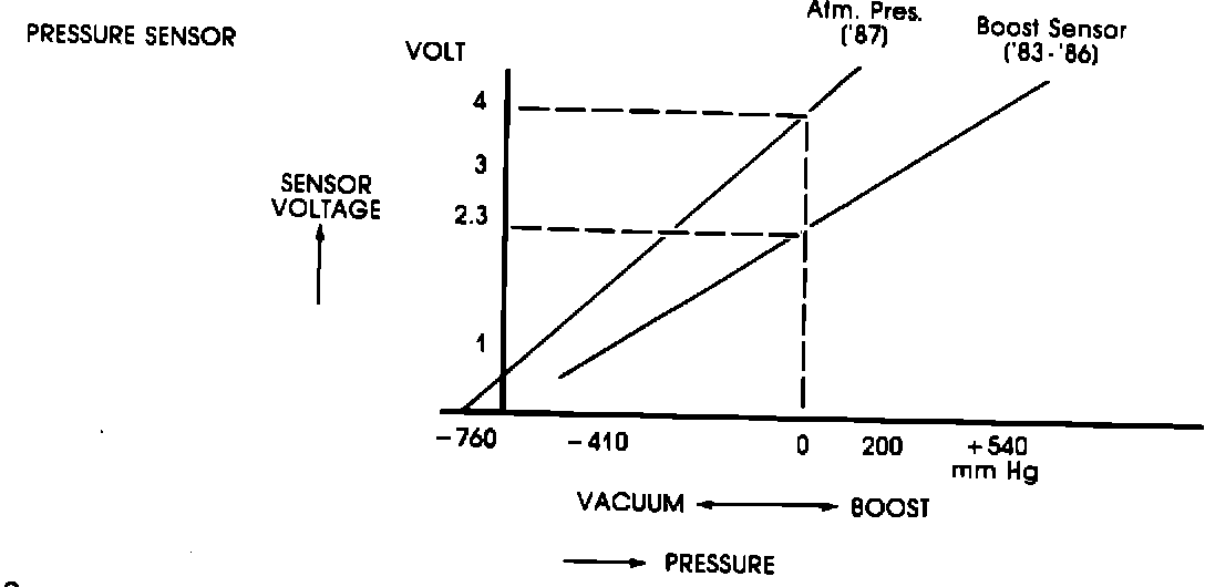 The manifold pressure sensor voltage output can range from 0V to 4V. When the engine is stopped, the output should be about 2.3V. See Fig. 10.