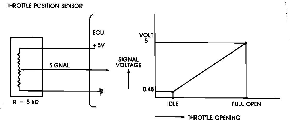 Output voltage of the Throttle Position Sensor should be familiar to every Mitsubishi technician because the initial setting is 0.48V. This is the voltage output of the sensor when the throttle is closed. At wideopen throttle, the output voltage increases to about 5V. See Fig. 11.