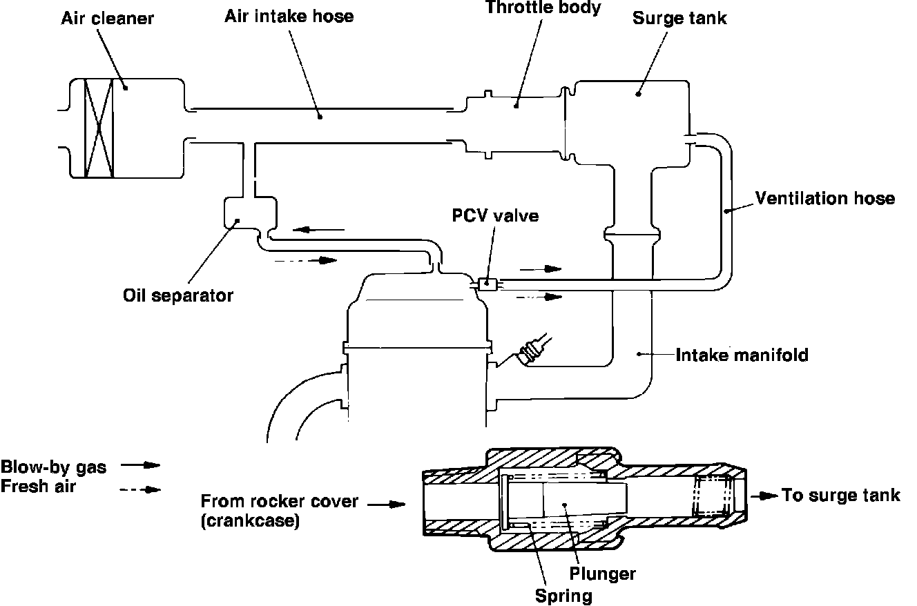 Fresh air is supplied to the crankcase through the air cleaner. Inside the crankcase fresh air is mixed with blow-by gases and this mixture passes through the PCV valve into the induction system.